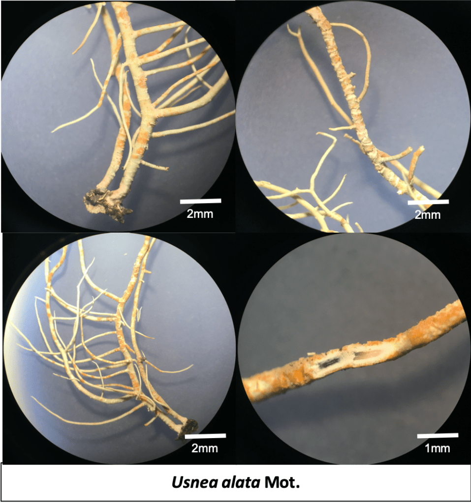 Usnea alata is a remarkable and rare find among the lichens of Bukit Larut, distinguished by its unique “winged” or angular branch structure. Unlike the cylindrical branches typical of most beard lichens, this species features stems that are noticeably flattened or tri-edged, creating thin ridges or “wings” that run along the length of the thallus. This structural adaptation provides a larger surface area to capture moisture from the mountain mists. Its growth habit is primarily pendent, with long, drooping grey-green strands that can give it a shaggy, architectural appearance. The surface is often sparsely covered in small, point-like soralia, and its internal medulla is typically quite dense. Because of its specialized shape and sensitivity to environmental shifts, Usnea alata is a high-value indicator of the ancient, undisturbed cloud forest conditions preserved at the higher elevations of Maxwell Hill.