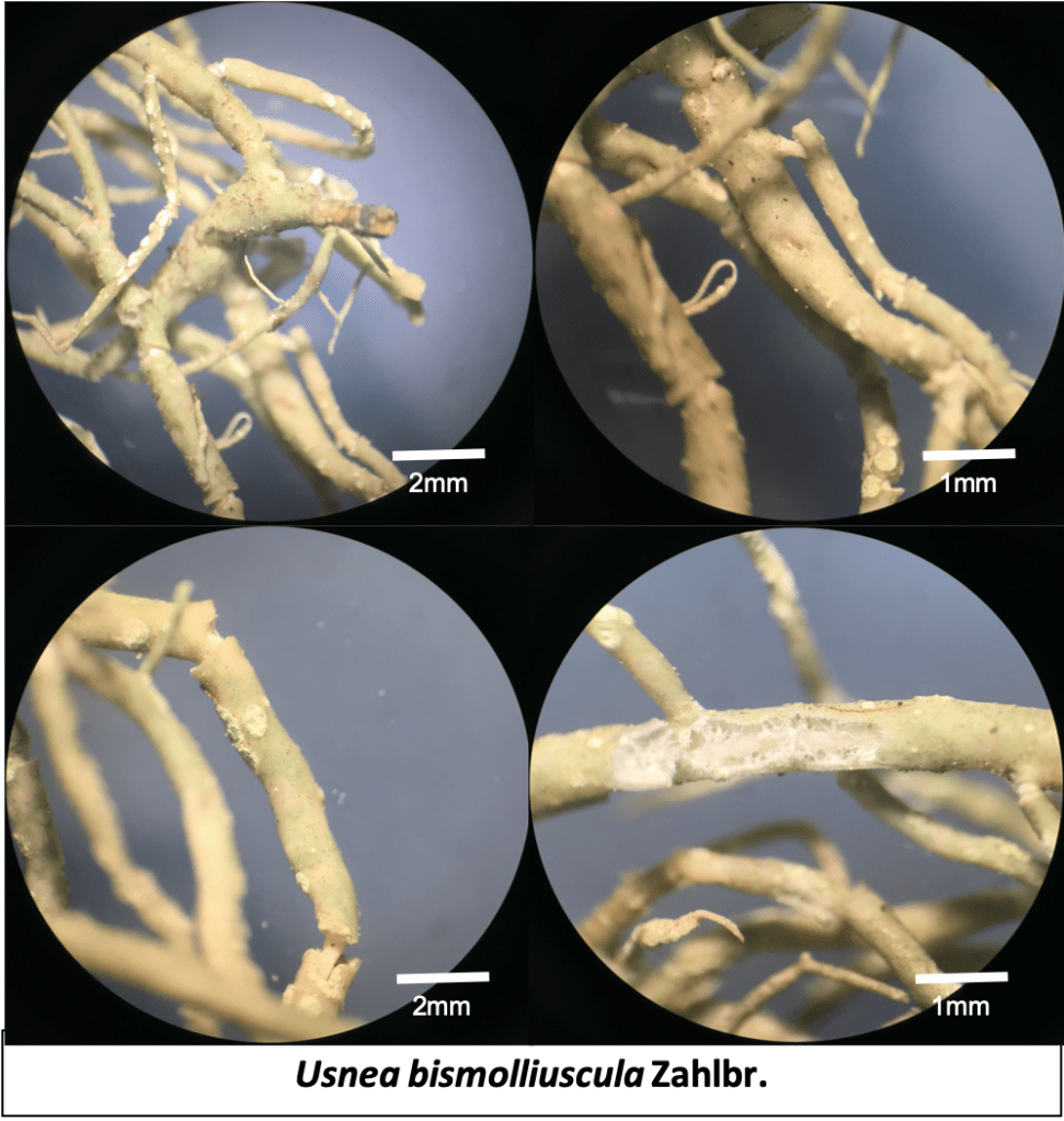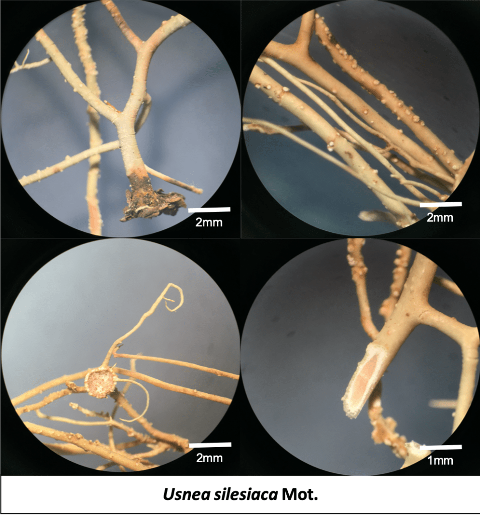 Usnea silesiaca is a distinctive shrubby to subpendent lichen that thrives in the moisture-rich, montane environments of Bukit Larut. This species is primarily identified by its robust, yellowish-green thallus and a branching pattern that is often slightly irregular and stiff. A key diagnostic feature is its surface, which is typically covered in numerous small, rounded soralia that produce a fine, powdery substance for reproduction; these spots are often slightly raised and can be found scattered across the main and secondary branches. Unlike some of its more “hairy” relatives, Usnea silesiaca lacks dense fibrils, giving it a cleaner but more “spotted” appearance. Internally, it features a strong, white central cord and a medulla that characteristically reacts K+ yellow turning red, indicating a high concentration of salazinic acid. Its presence is a testament to the high air quality and consistent fog drip that characterizes the “cloud forest” zones of Maxwell Hill.