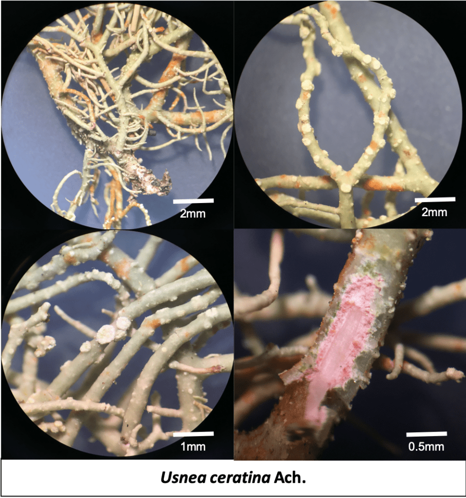 Usnea ceratina, frequently referred to as the “warty beard lichen,” is a pendulous species that adds a rugged, textured appearance to the mist-soaked branches of Bukit Larut. Unlike its smoother relatives, this lichen is easily recognized by its coarse, gritty thallus, which is heavily covered in small, pimple-like bumps called tubercles. These warts often burst to form granular soralia, giving the grey-green branches a roughened, “shaggy” feel to the touch. One of its most distinctive internal features is a pale pinkish medulla (the inner layer) and a similarly colored central cord, which can be seen if the branch is gently snapped. Highly adapted to humid, high-altitude cloud forests, Usnea ceratina is a sensitive bio-indicator; its flourishing presence on the hill is a testament to the clean air and low sulfur dioxide levels of the surrounding environment.