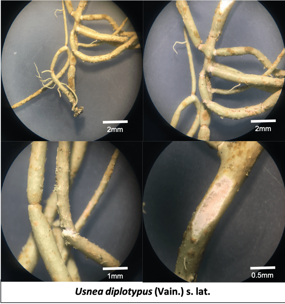 Usnea diplotypus is a shrubby, tufted lichen that often takes on a slightly drooping or subpendent appearance as it matures on the tree barks of Bukit Larut. It is characterized by its uneven, irregularly swollen branches that frequently display small depressions and twisted tips, giving it a somewhat distorted silhouette. A key identifying feature is the presence of numerous isidiomorphs—slender, finger-like reproductive outgrowths—that are relatively long compared to similar species. Its pale yellow-green thallus typically has a thin outer cortex and a medulla of variable density, which reacts K+ yellow to red in chemical tests, signaling the presence of salazinic acid. This hardy species is particularly well-adapted to well-lit, moist sites, and its occurrence at higher elevations confirms the presence of the clean, oxygen-rich environment characteristic of Maxwell Hill.