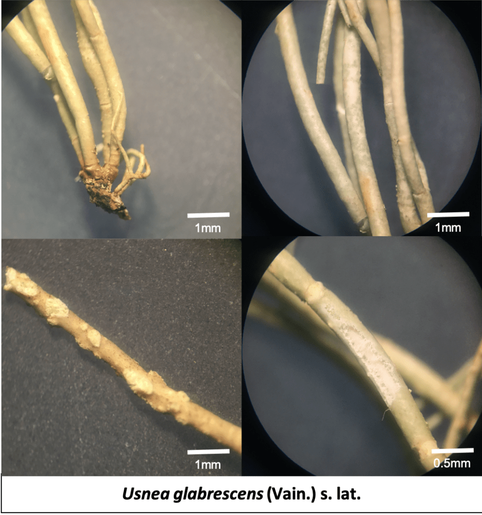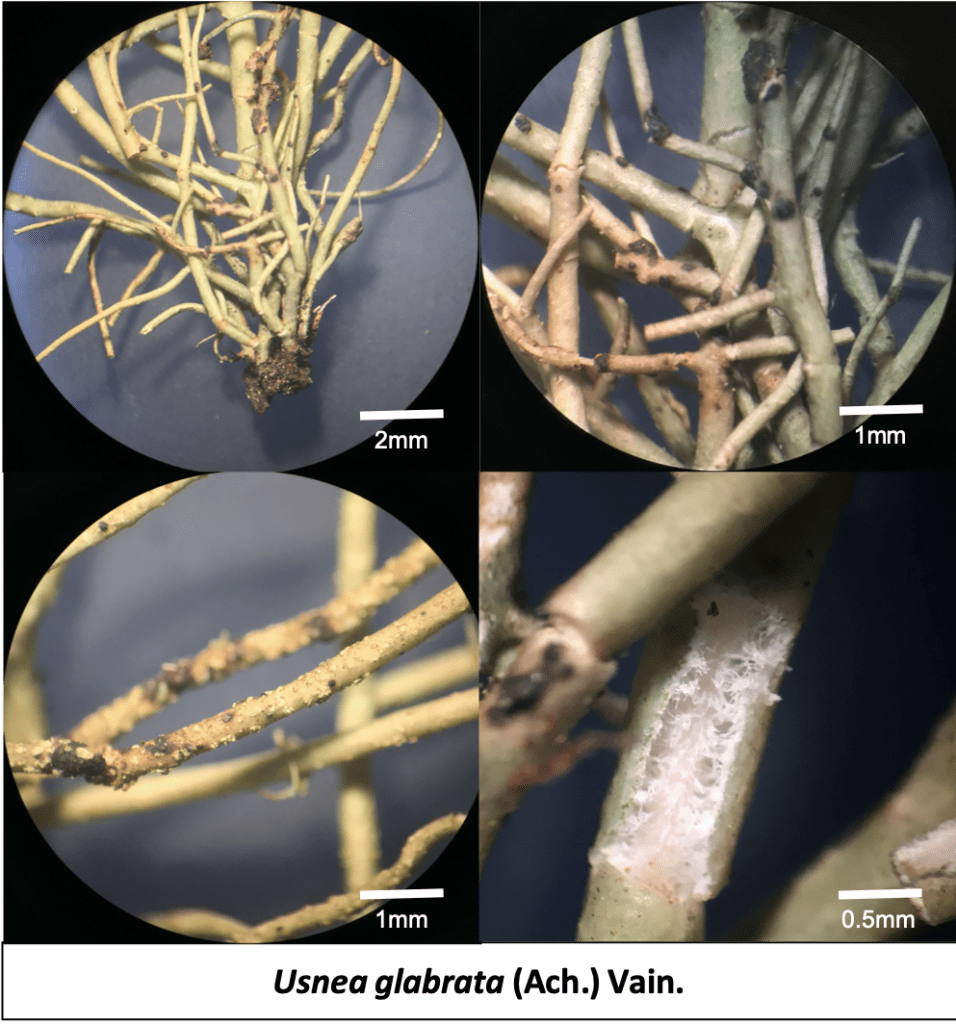 Usnea glabrata, often called the “bald beard lichen,” is a small, shrubby species that forms compact, tufted colonies on the twigs and small branches of trees in Bukit Larut. True to its name, this lichen has a relatively “bald” or smooth appearance, lacking the dense hair-like fibrils found in many of its relatives. It is most easily identified by its inflated (swollen) terminal branches that often end in large, distinctive patches of soralia. These reproductive spots are unique because they appear at the very tips of the branches, often becoming wider than the branch itself and appearing “capitate” or head-like. Its pale yellowish-green thallus usually features a pale, unblackened base, and its presence is a definitive sign of the high humidity and exceptionally clean, mist-filtered air found near the summit of Maxwell Hill.